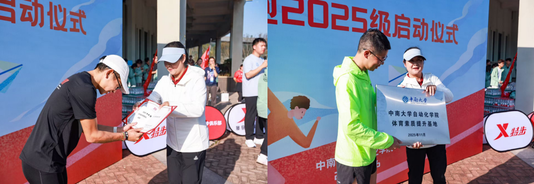 黄亚为追风跑团的向云路教练颁发聘书,并与刘文甫一同向校运会优秀运动员代表颁奖以及为中南大学自动化学院体育素质提升基地揭牌。优秀运动员代表孙奥飞和李春梅在发言中希望同学们拥抱阳光、积极运动。体育部杨锦绣为同学们介绍环校跑的打卡规则与注意事项。追风跑团的李修齐呼吁大家加入跑团,一起享受运动乐趣。