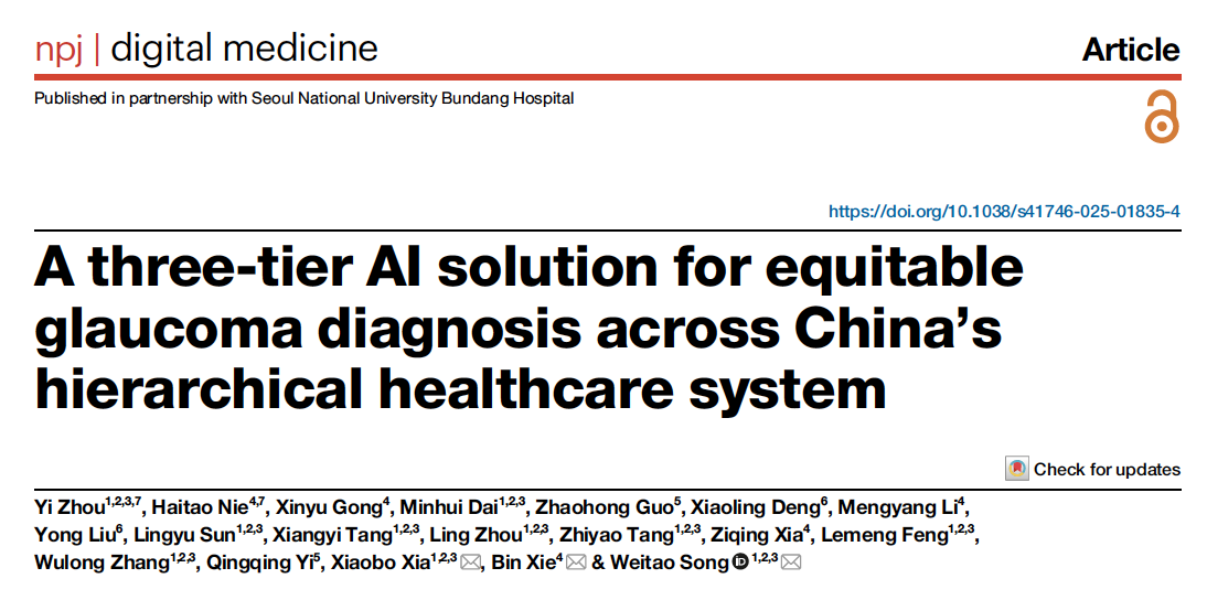 近日,自动化学院谢斌副教授团队联合中南大学湘雅医院夏晓波、宋伟涛教授团队在国际权威期刊《npj Digital Medicine》发表题为 “A three-tier AI solution for equitable glaucoma diagnosis across China’s hierarchical healthcare system(服务于中国分级诊疗体系的三层级人工智能系统:实现青光眼诊断的同质化)”的研究论文。中南大学湘雅医院眼科中心主治医生周一与自动化学院2025级博士研究生聂海涛为共同第一作者,谢斌副教授和湘雅医院眼科中心宋伟涛副教授、夏晓波教授为共同通讯作者。该期刊为Nature子刊,中科院1区Top期刊,影响因子15.1。